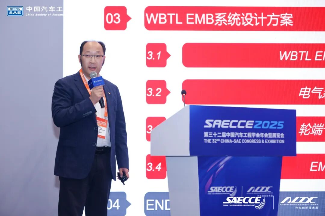 大会期间,伯特利基础制动总工李运动先生以“EMB技术方案及开发进展情况”为主题分享了伯特利在机械式线控制动领域的最新进展。机械式线控制动系统EMB,通过中央控制器CCU将接收到的电子制动踏板信号传递至轮端WCU,通过WCU电机转动推动活塞向前运动,达到制动目的。